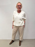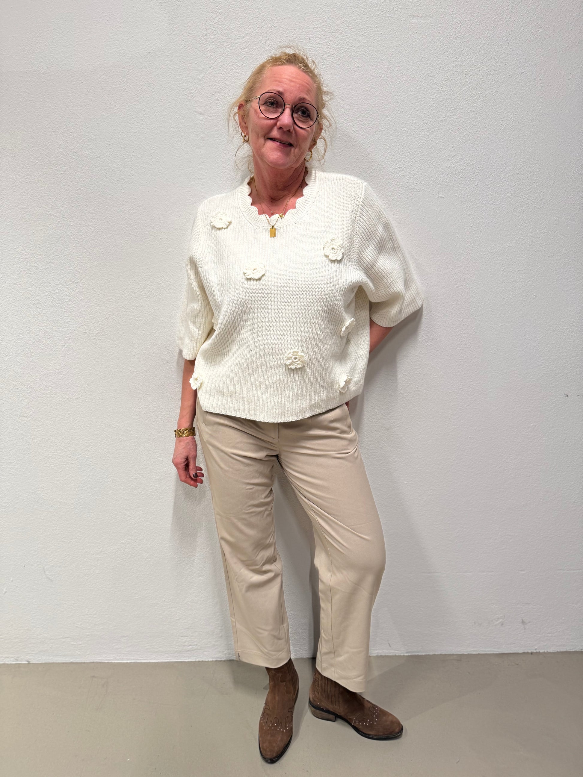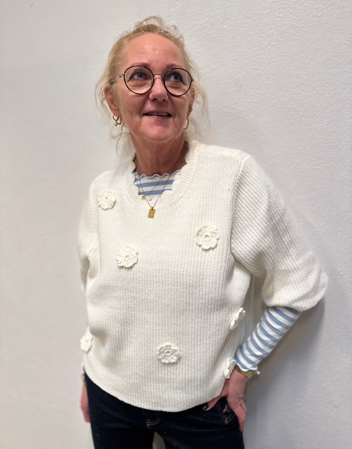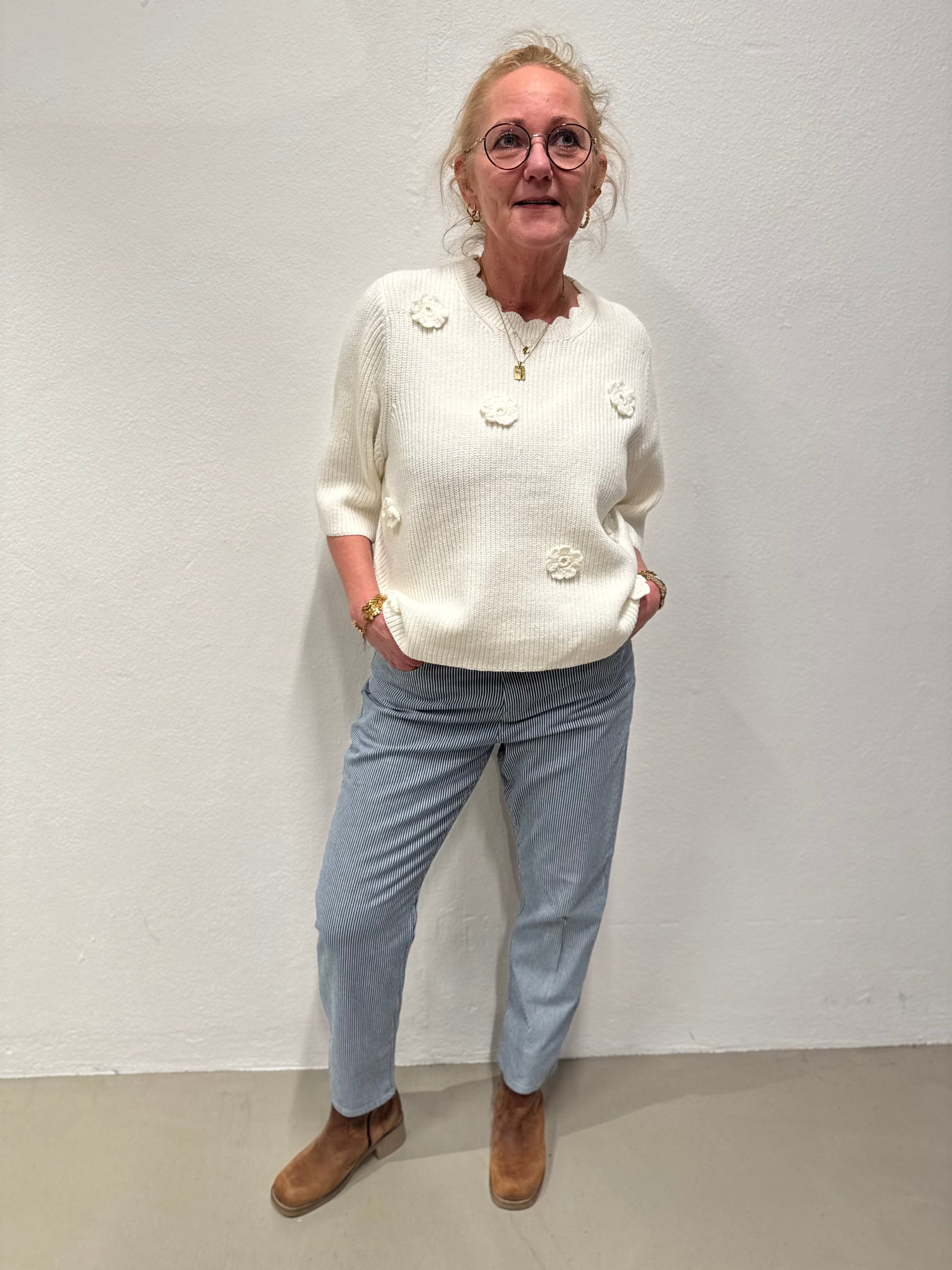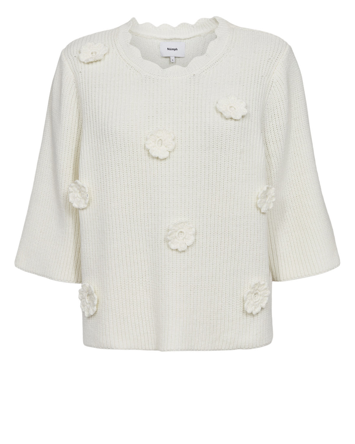 Denne skønne kortærmet fra Nümph er et must have. Strikken har den fineste runde hals med bølge effekt, som står smukt til de fine blomster som er på syet. Strikken er med trekvartærmer som har en lille smule vidde-
