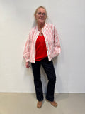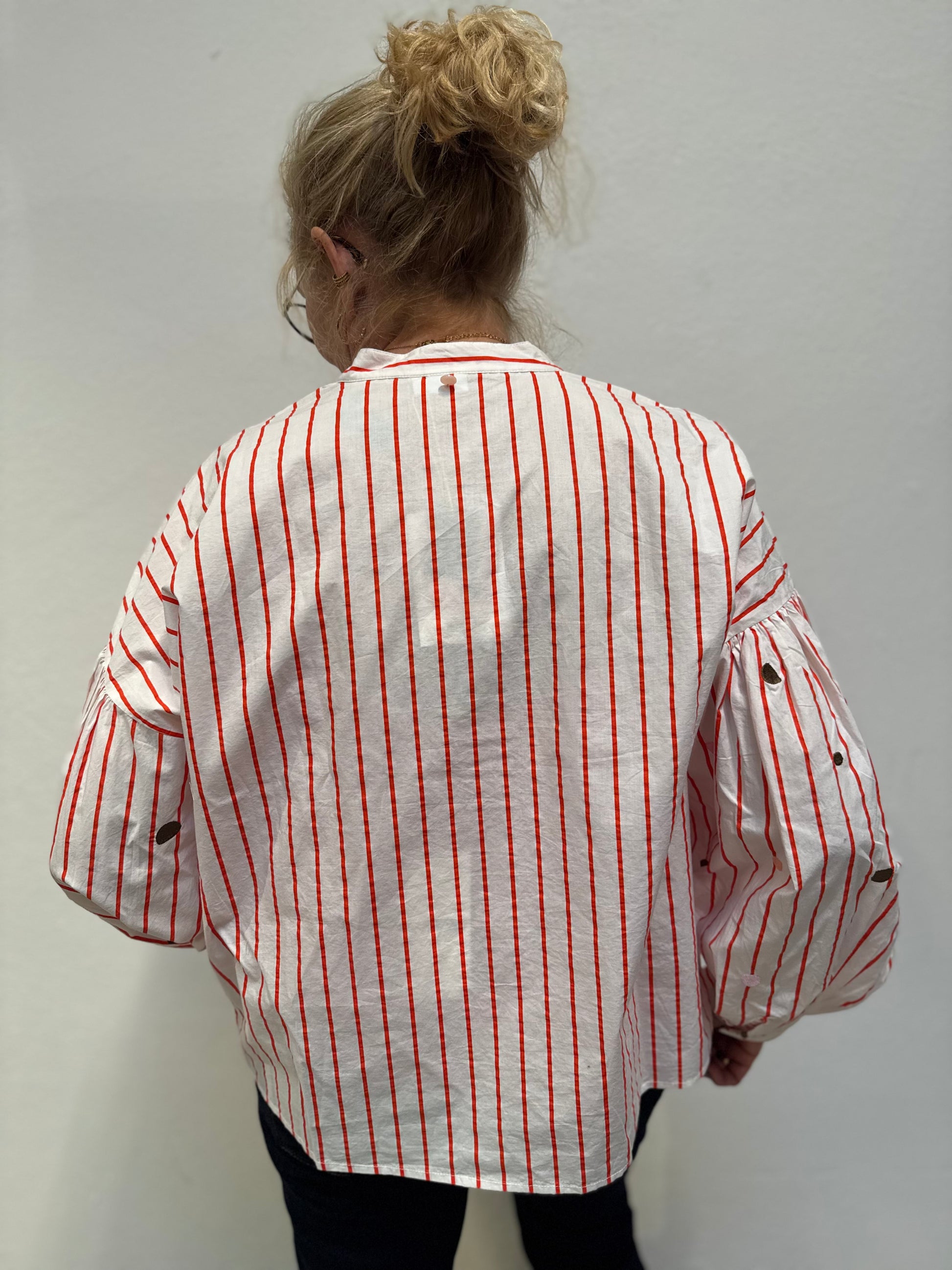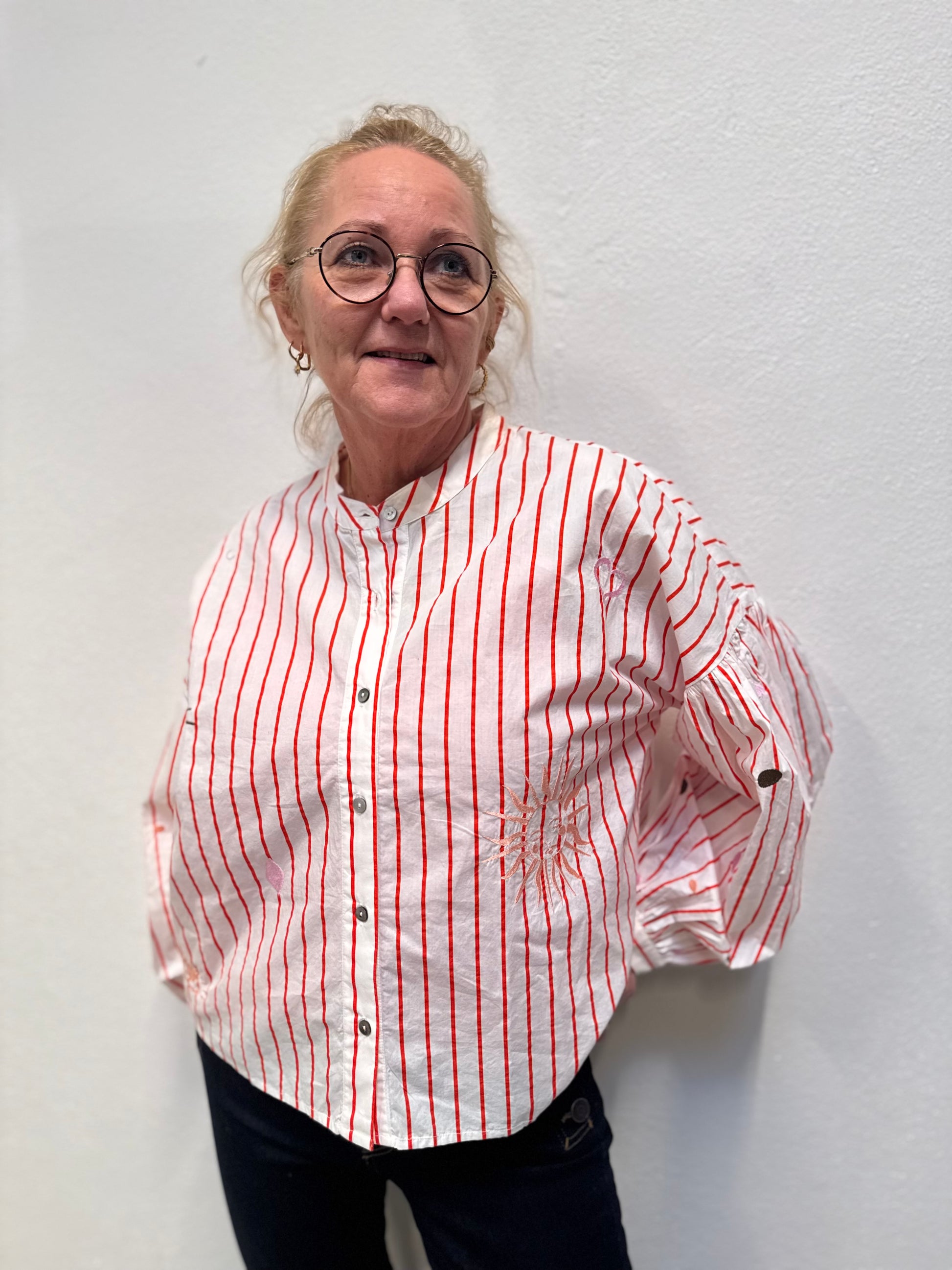 Denne stribet skjorte fra Nümph har de fineste broderede figurer. Skjorten har en fin kinakrave og knaplukning, men for at give lidt ekstra har den lange bredde ærmer, som skaber en smule ballon effekt.