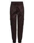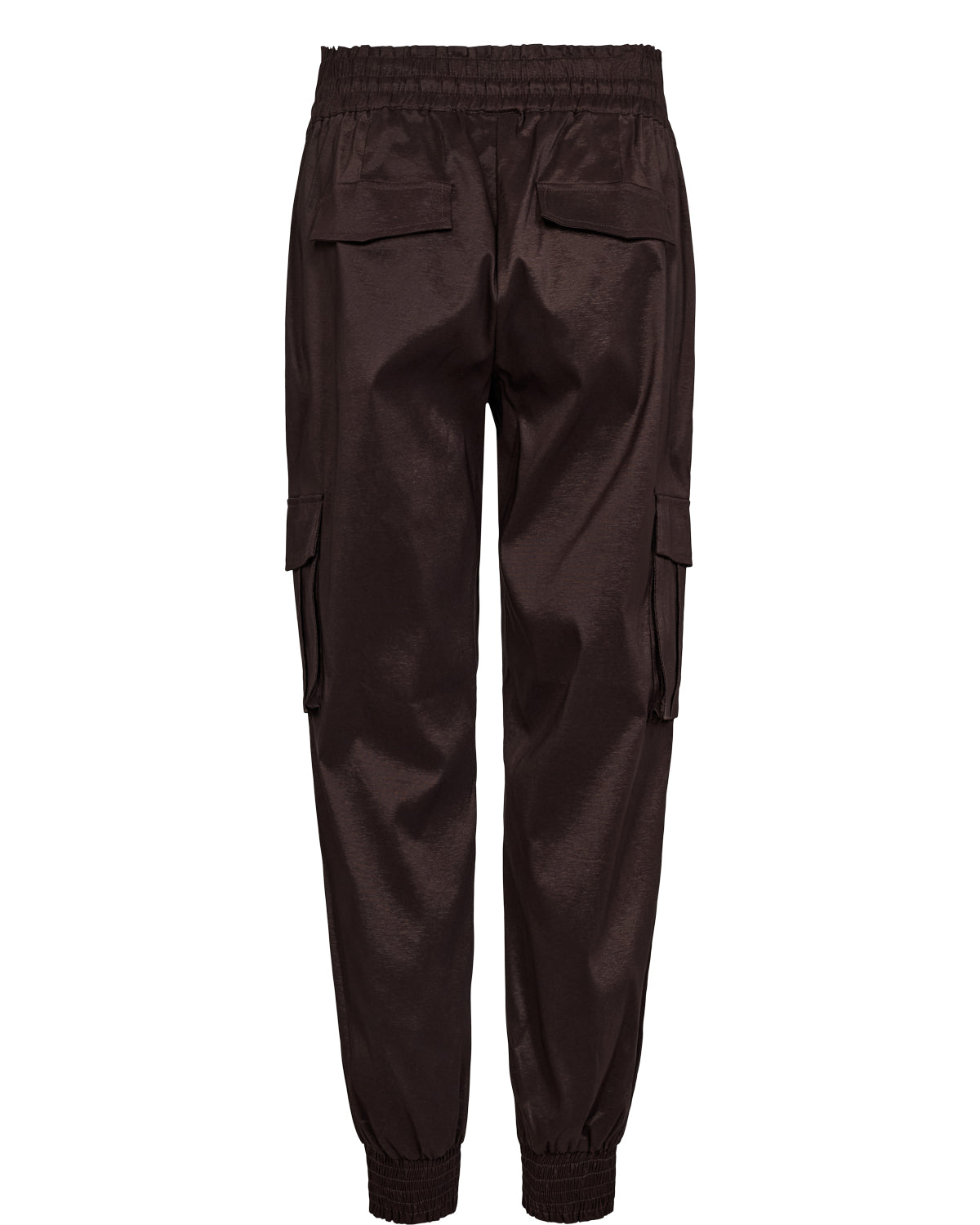 Super lækre Cargo inspirerede bukser med en fed shine effekt. Bukserne har en rigtig fed pasform, med sit bredde elastik stykke i taljen sidder bukserne rigtig godt til foroven og falder utroligt flot, desuden har de et lille bånd, så de kan snøres til. Det brede elastik stykke ved benene gør dem oplagte til brug i støvler, da de vil falde fedt udover støvlerne.
