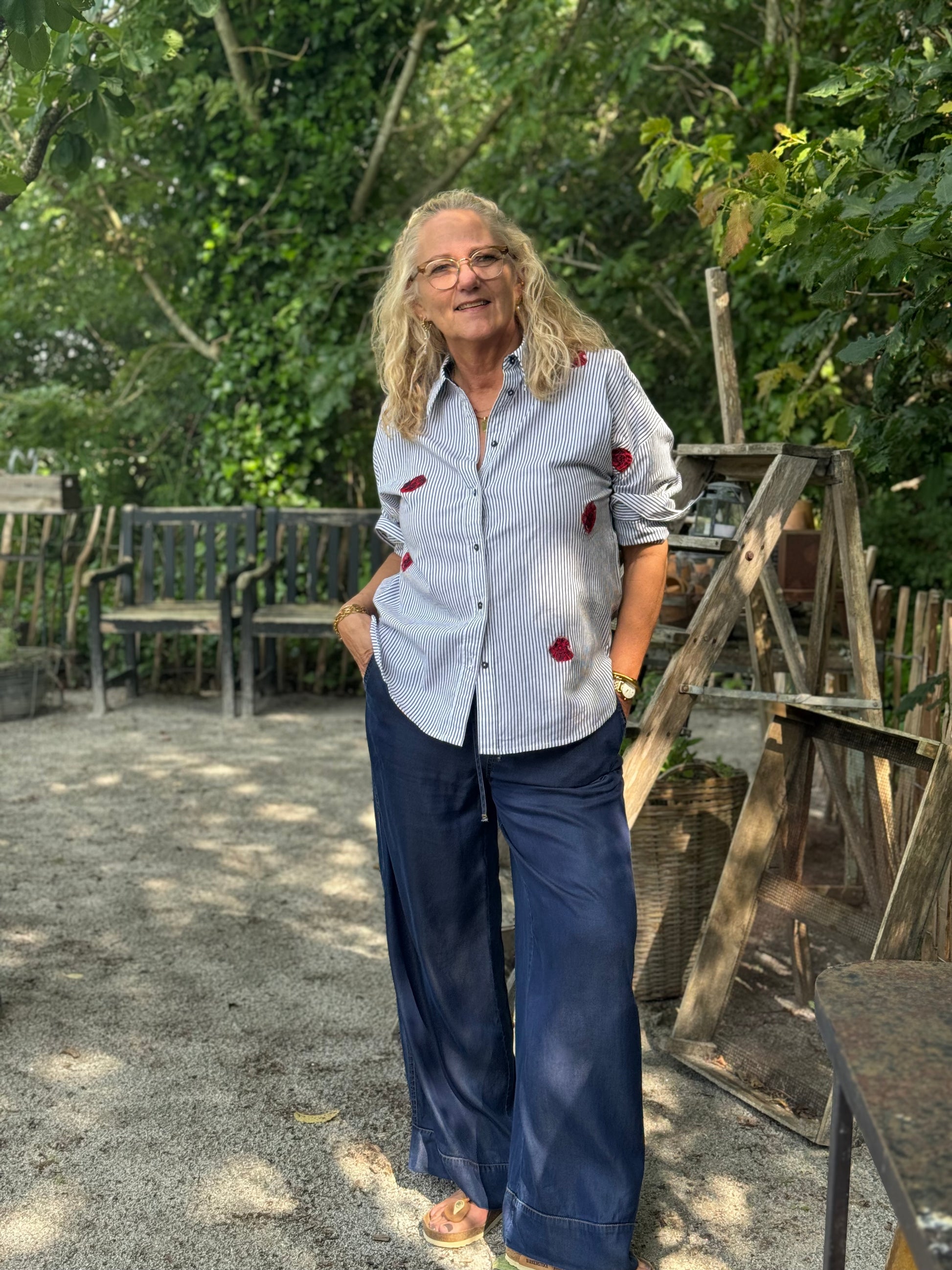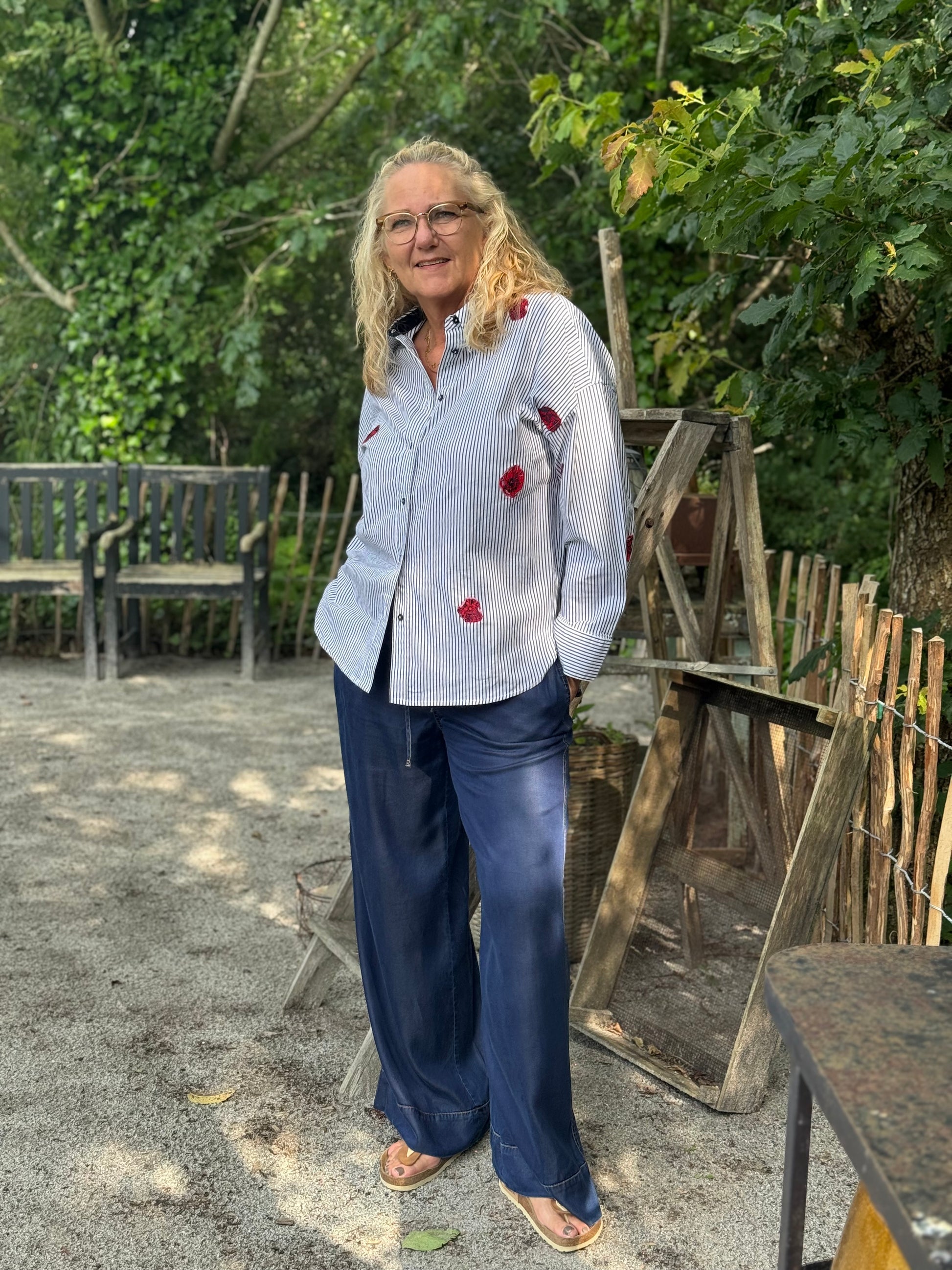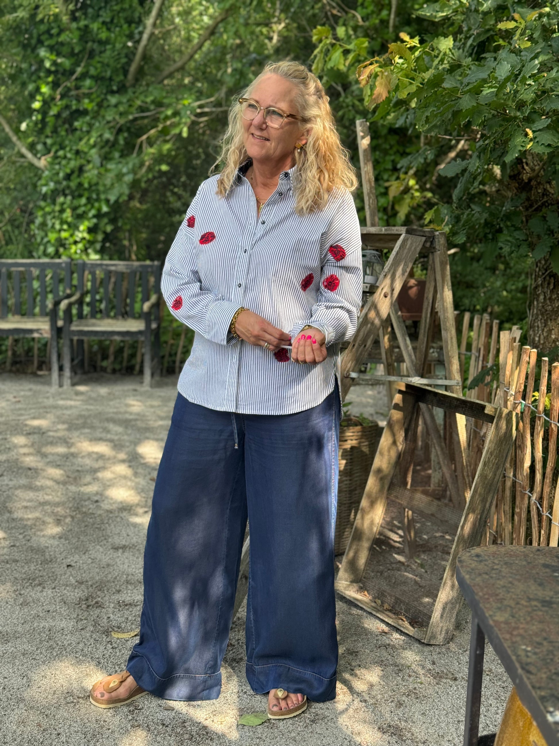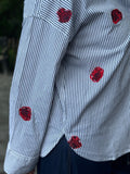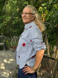 Her får du en rigtig Nümph skjorte i en mørkeblå og hvis strib, med de fineste røde broderet blomster. Skjorten har den klassiske skjortekrave med knappelukning foran. Skjorten har bredde i ærmets, som afsluttes med en klassisk bred manchet.