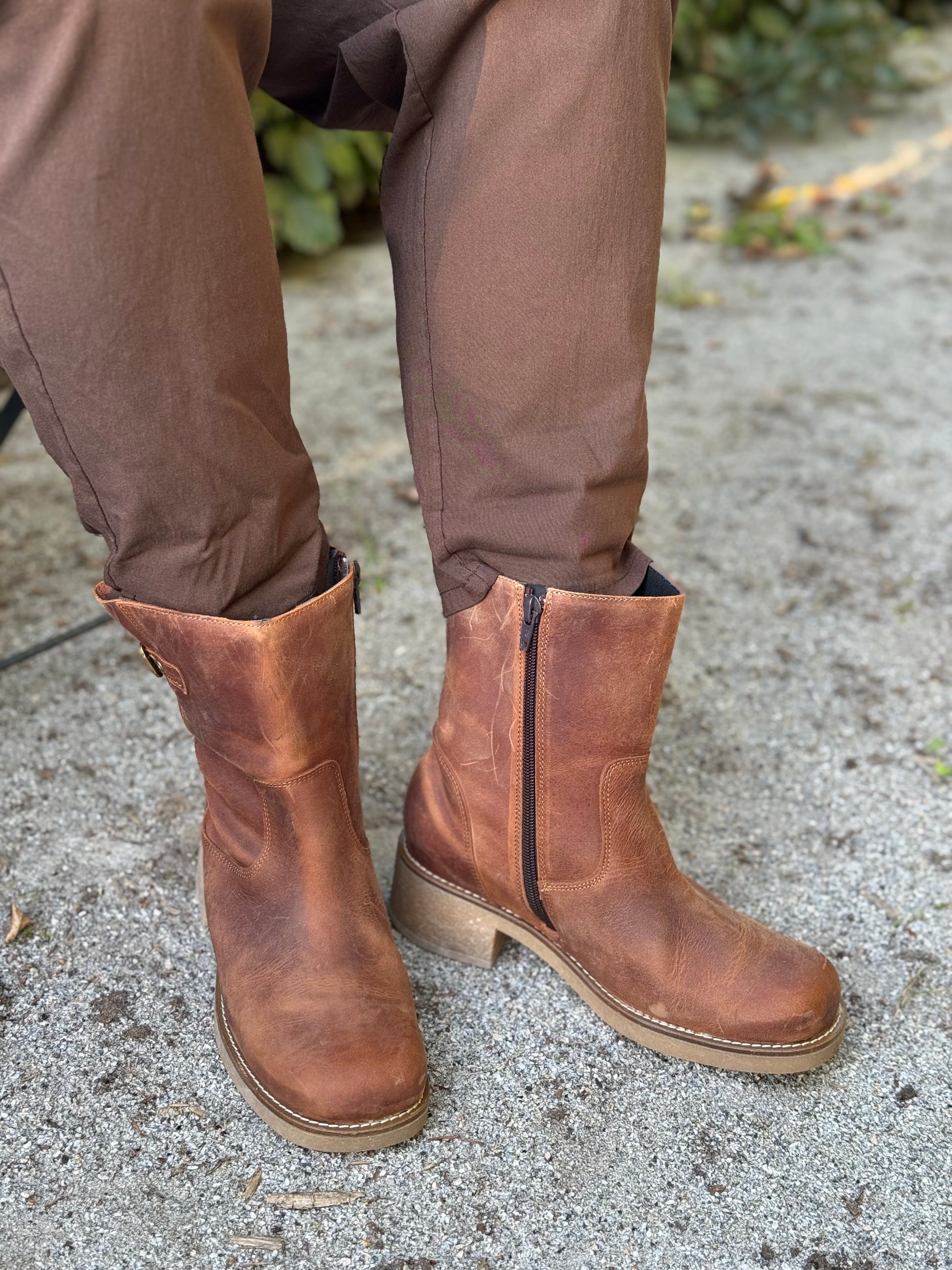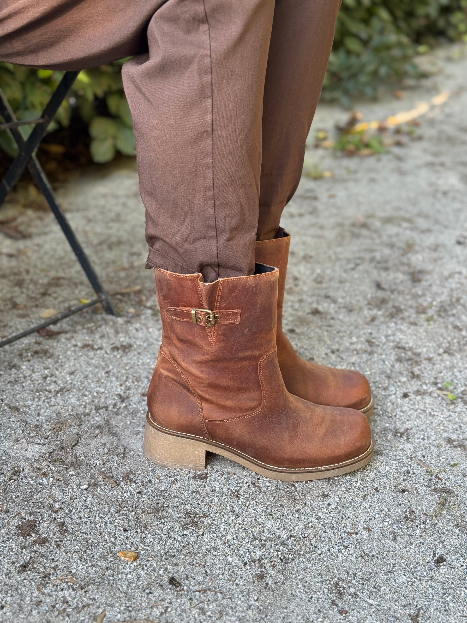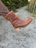 Støvlen er fyldt med lækre detaljer, som det “vaskede” skind, som giver et unikt udtryk, hvilket sammen remmen og den firkantet snude giver et råt look. Selvom støvlen har en lille hæl er den stadig komfortabel, da den er lækker blød.