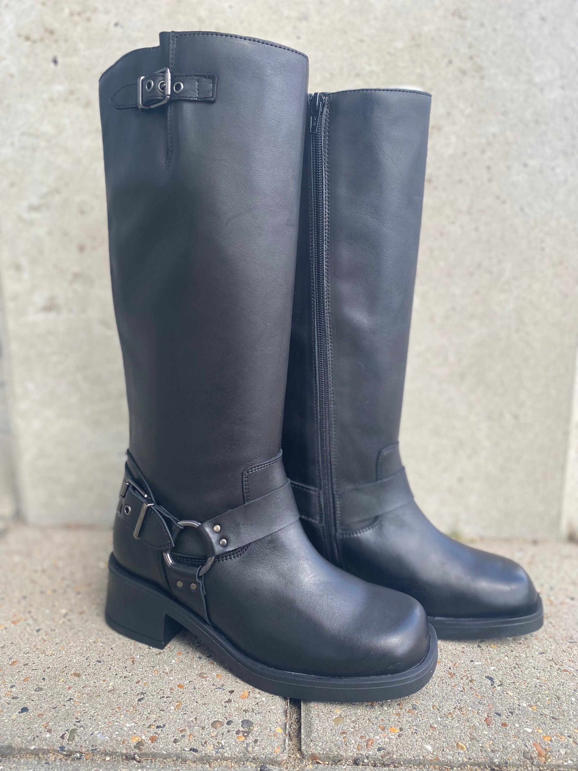 Støvlen har de lækreste detaljer, som de lidt blanke sorte skind og remme, som giver et unikt udtryk, sammen med den firkantet snude. Støvlen har en lille hæl, men er stadig komfortabel at gå i en hel dag, da den er dejlig blød.