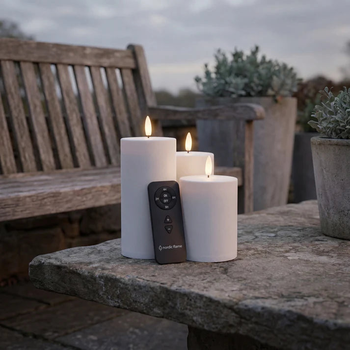 Skab en smuk, stemningsfuld og vedligeholdelsesfri belysning udendørs med dette sæt af 3 eksklusive LED-bloklys fra Nordic Flame, designet til altan, terrasse, have og indgangsparti. Lysenes naturtro flamme, robuste konstruktion og lange batteritid gør dem til den perfekte løsning til hygge året rundt.
