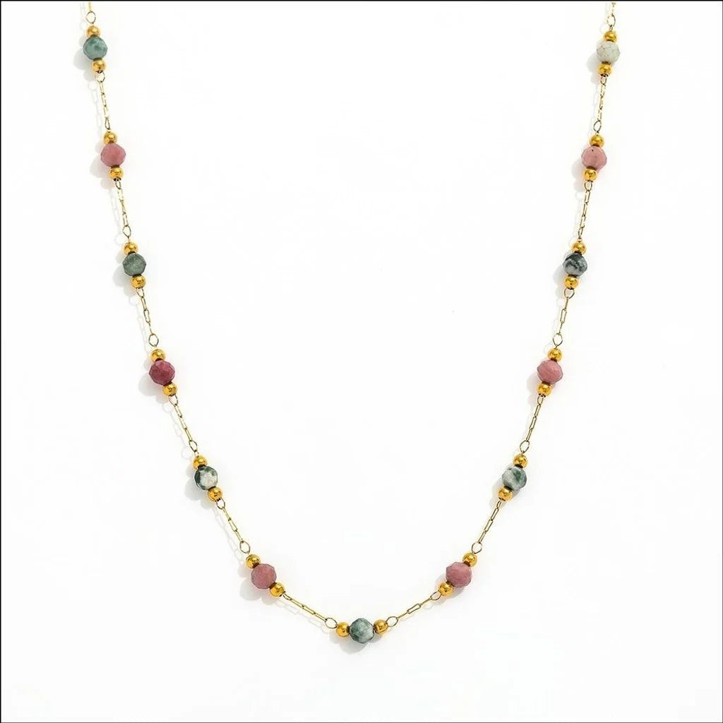 Denne smukke halskæde med Lyserøde og grønne perler, er perfekt til at tilføje farve til dit outfit. Halskæde har en klassisk karabinlås og forlænger
